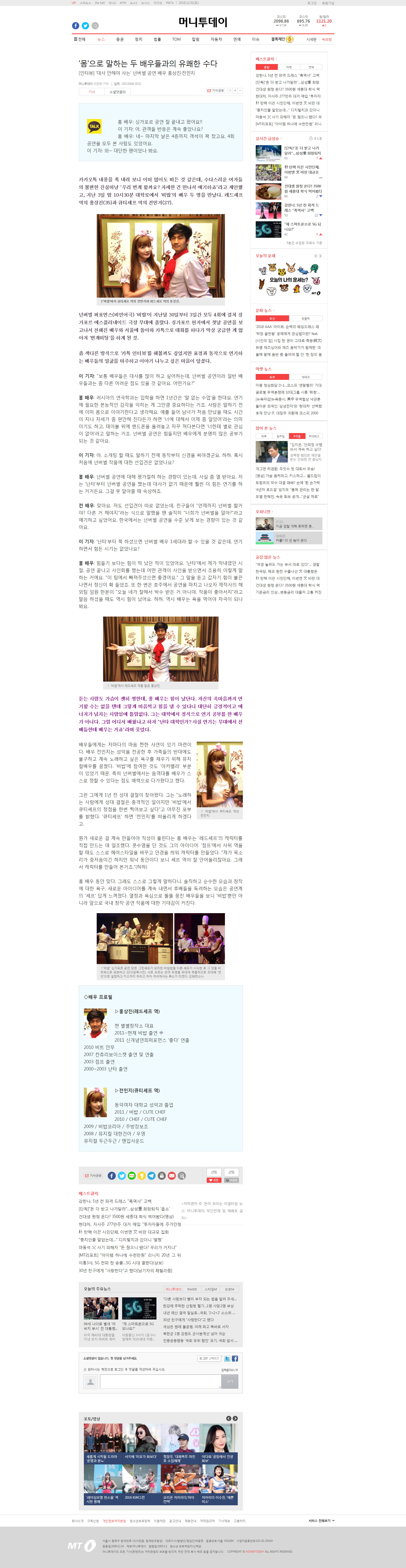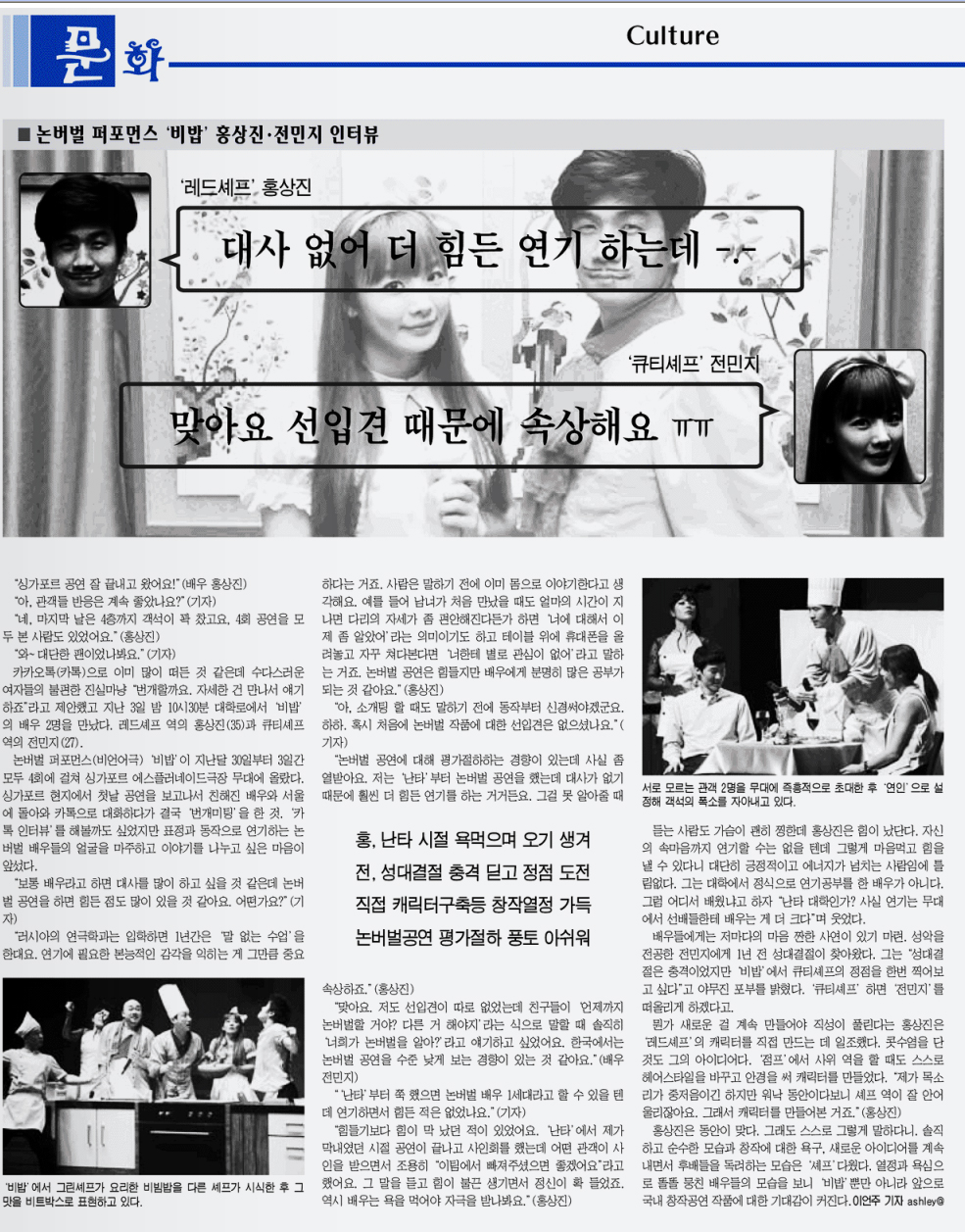 NEWS l머니투데이] '대사 안해야 사는' 넌버벌 공연 배우 머니투데이 2012년 4월 6일 '대사 안해야 사는' 넌버벌 공연 배우 홍상진·전민지 공유하기 게시글 관리 별별창작소 'NEWS' Related Contents 무용월간지 [몸] 제 11회 서울국제즉흥춤축제 릴레이즉흥 II [데일리안] 안산문예당 '빗자루를 든 사나이' 공연 [강원일보 ] 무술·발레·탈춤 … 뮤지컬에 녹여내다 [아리랑TV] 토크쇼 Heart to Heart <별별창작소 대표>연출가 홍상진