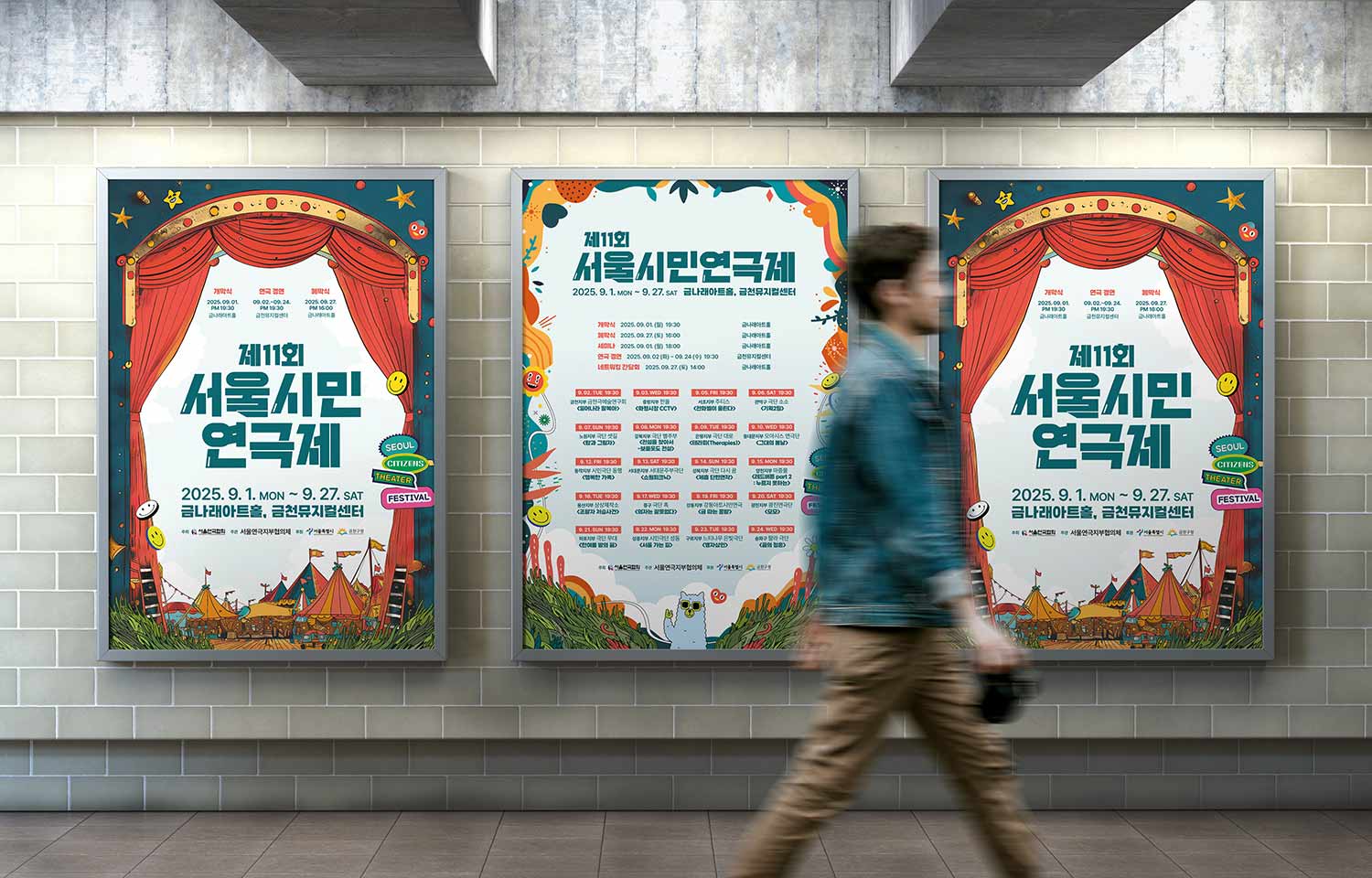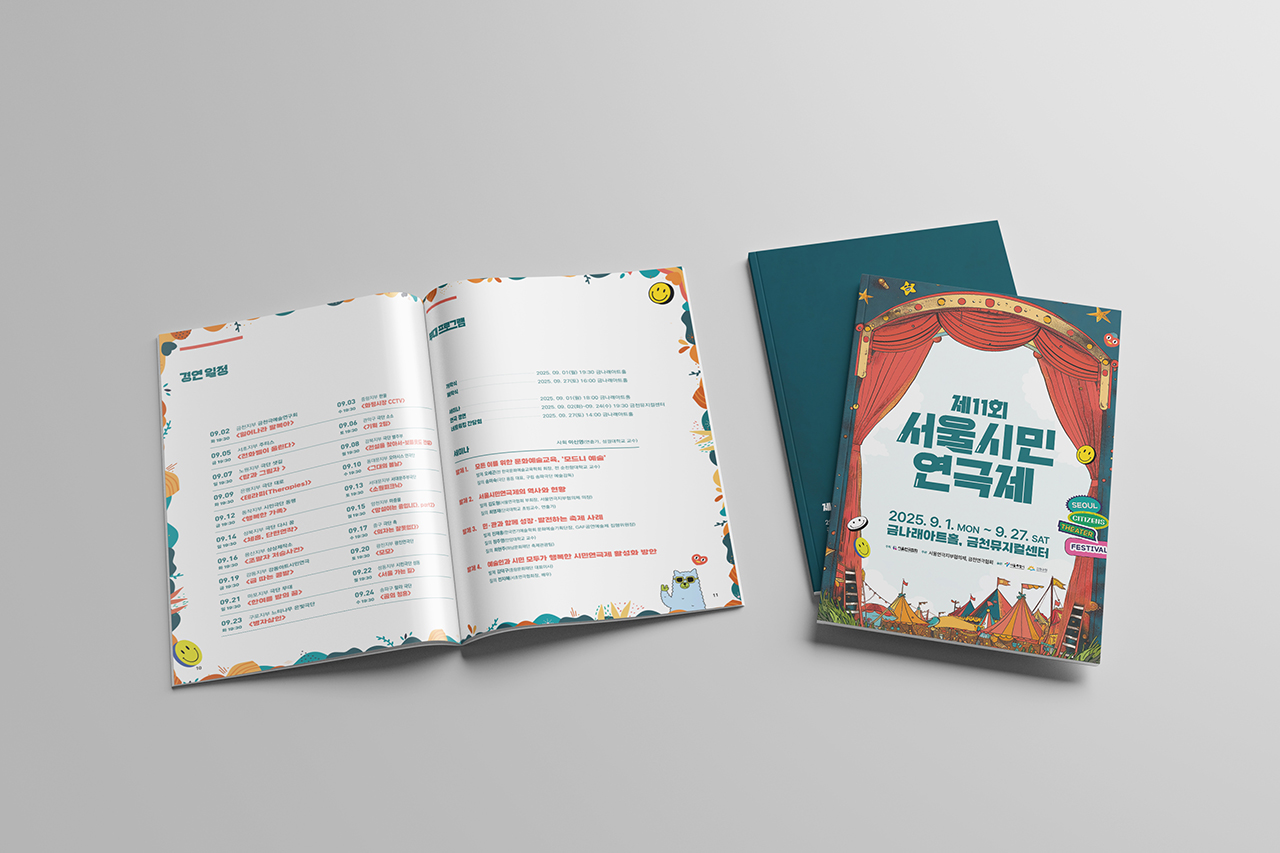 붉은 커튼과 위트 있는 일러스트를 통해, 시민이 무대의 주체가 되는 연극제의 정체성을 시각화한 브랜딩